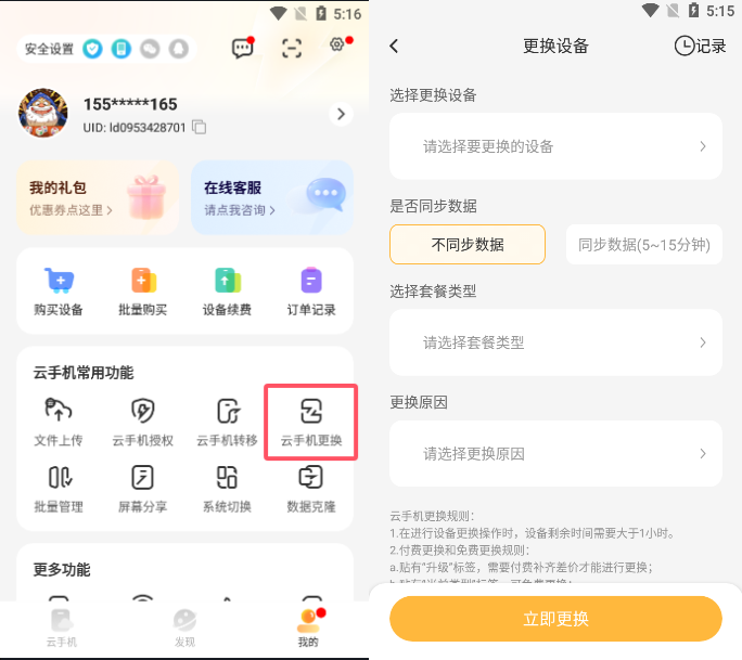 第二种:点击“我的”,然后选择“云手机更换”