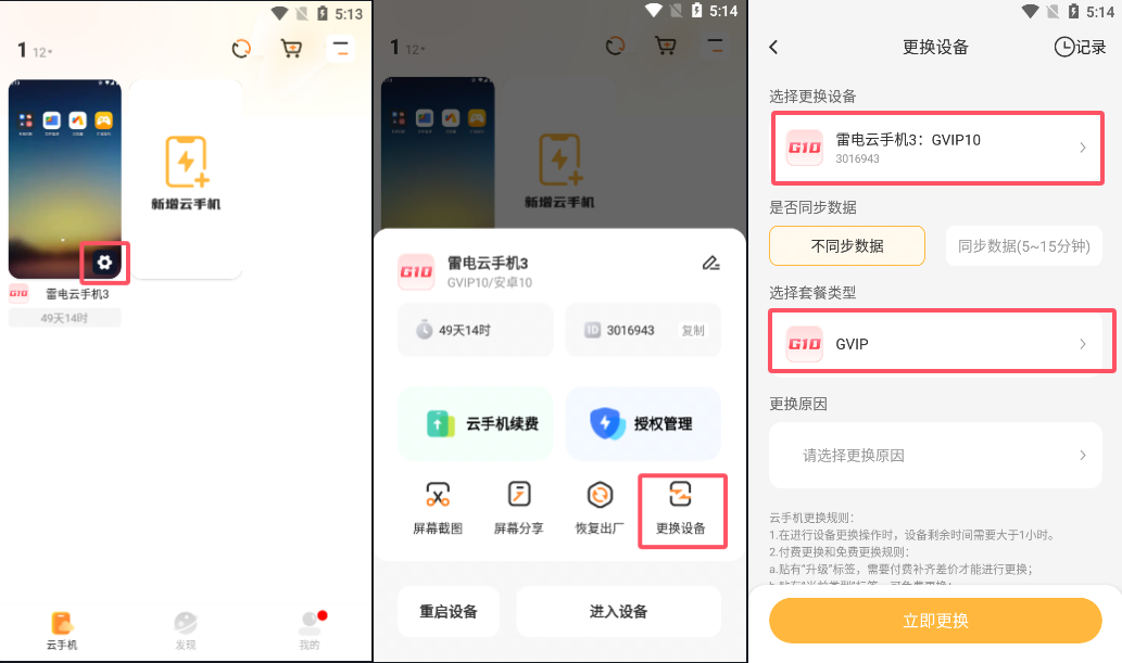 都选好以后点击“立即更换”(点击“立即更换”,会有提示,更换设备会清理数据和设备已安装的软件)