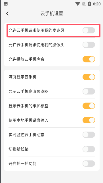 1、点击我的-云手机设置,可以找到麦克风权限的开关。