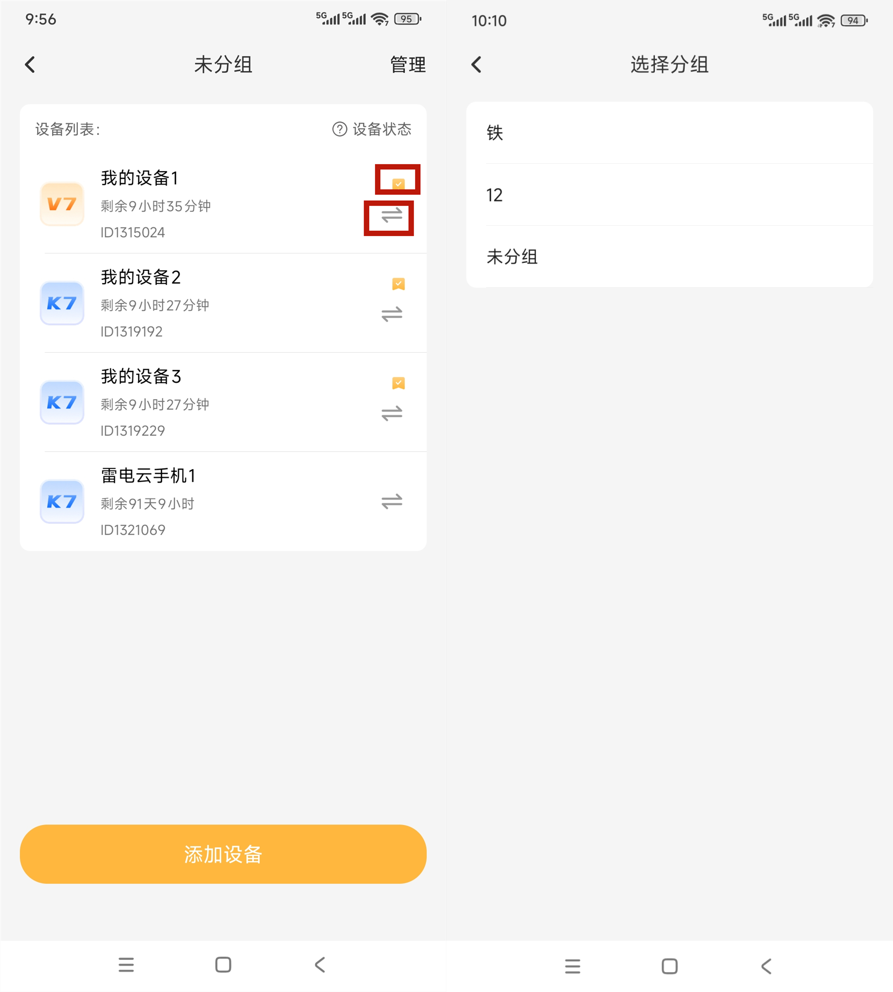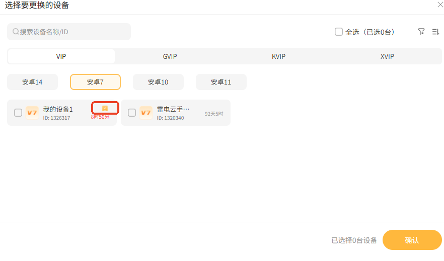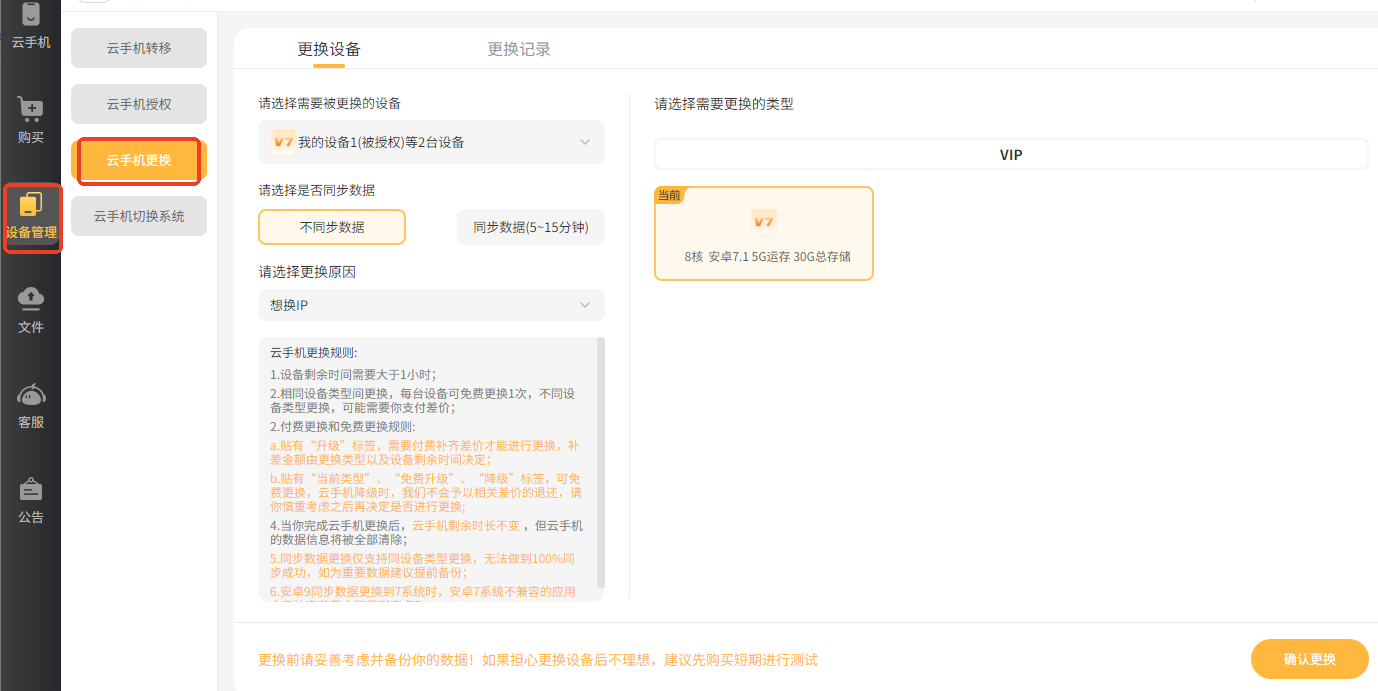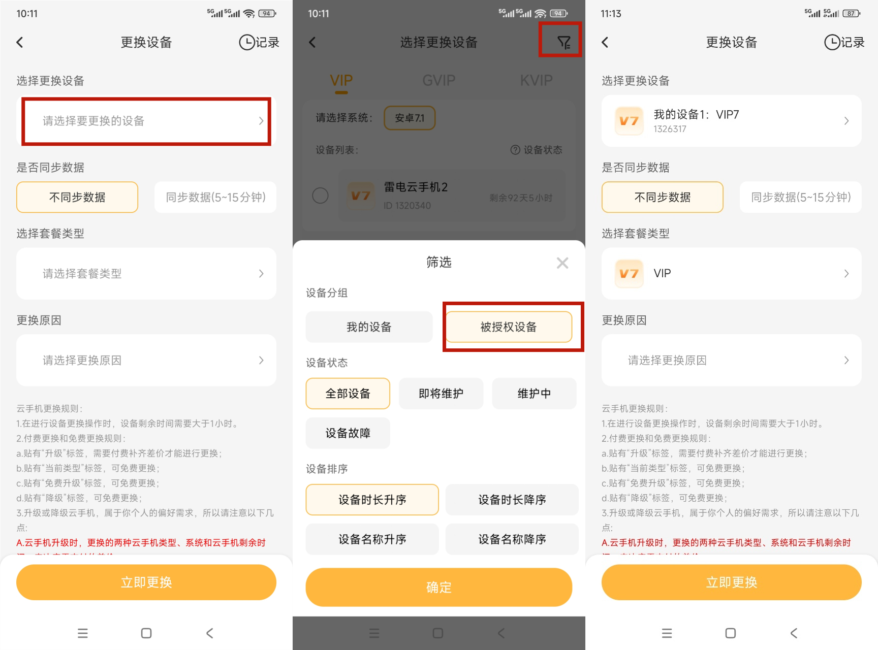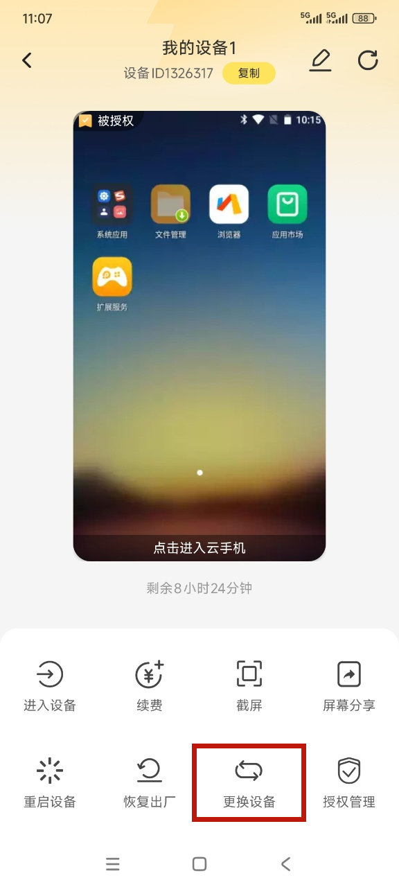 在“设备管理-云手机更换”找到自己的被授权设备,选好以后去更换即可,一台或者多台都是在这里操作的(下图中红框里面的标志即为被授权的设备标志)。