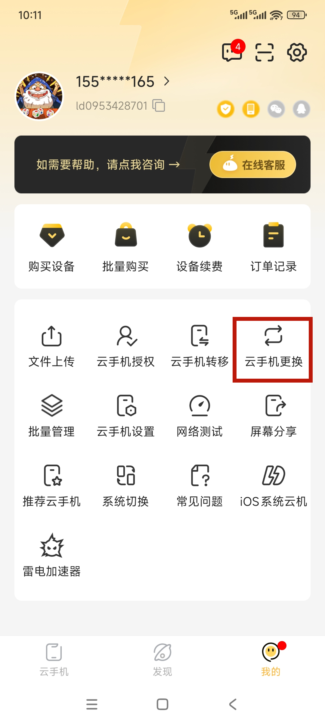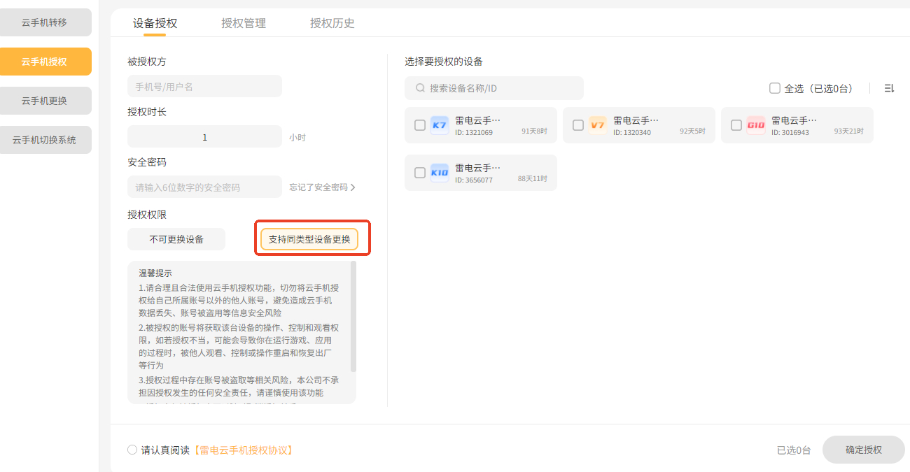 要同时更换多台被授权设备的,可以在“我的-云手机更换”里面去操作。