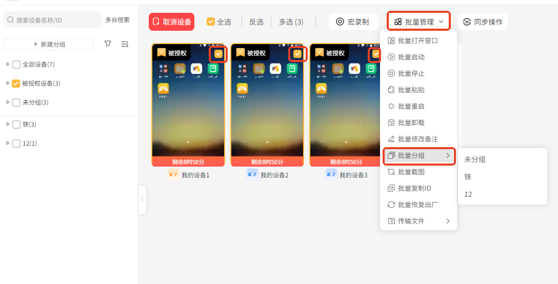 先点击“选择设备”,勾选要移动分组的设备,选好以后点击“批量管理-批量分组”,选好要移动到哪个分组即可。