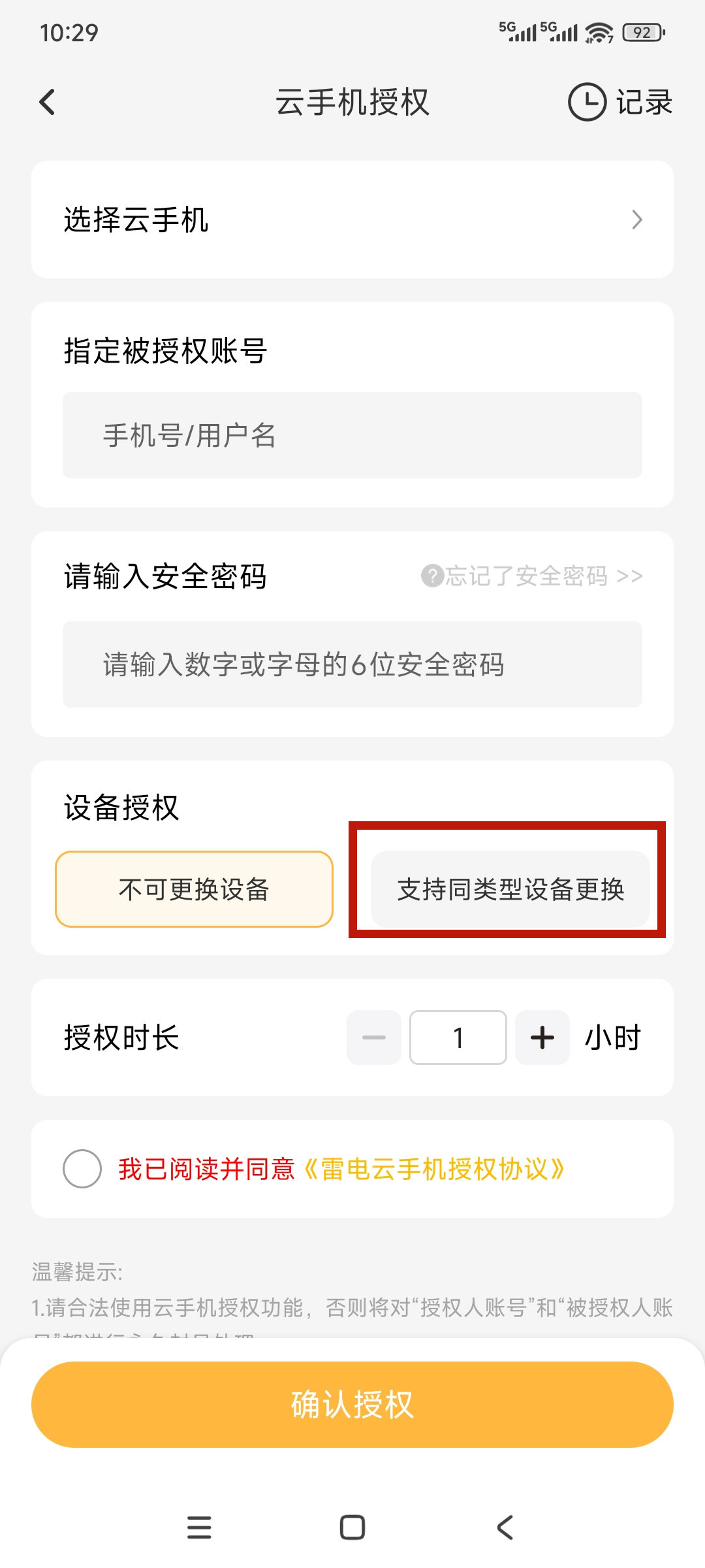 其次要被授权设备要更换设备的话,授权人一开始要给权限,既授权的时候要勾选下图所示的“支持同类型设备更换”权限。