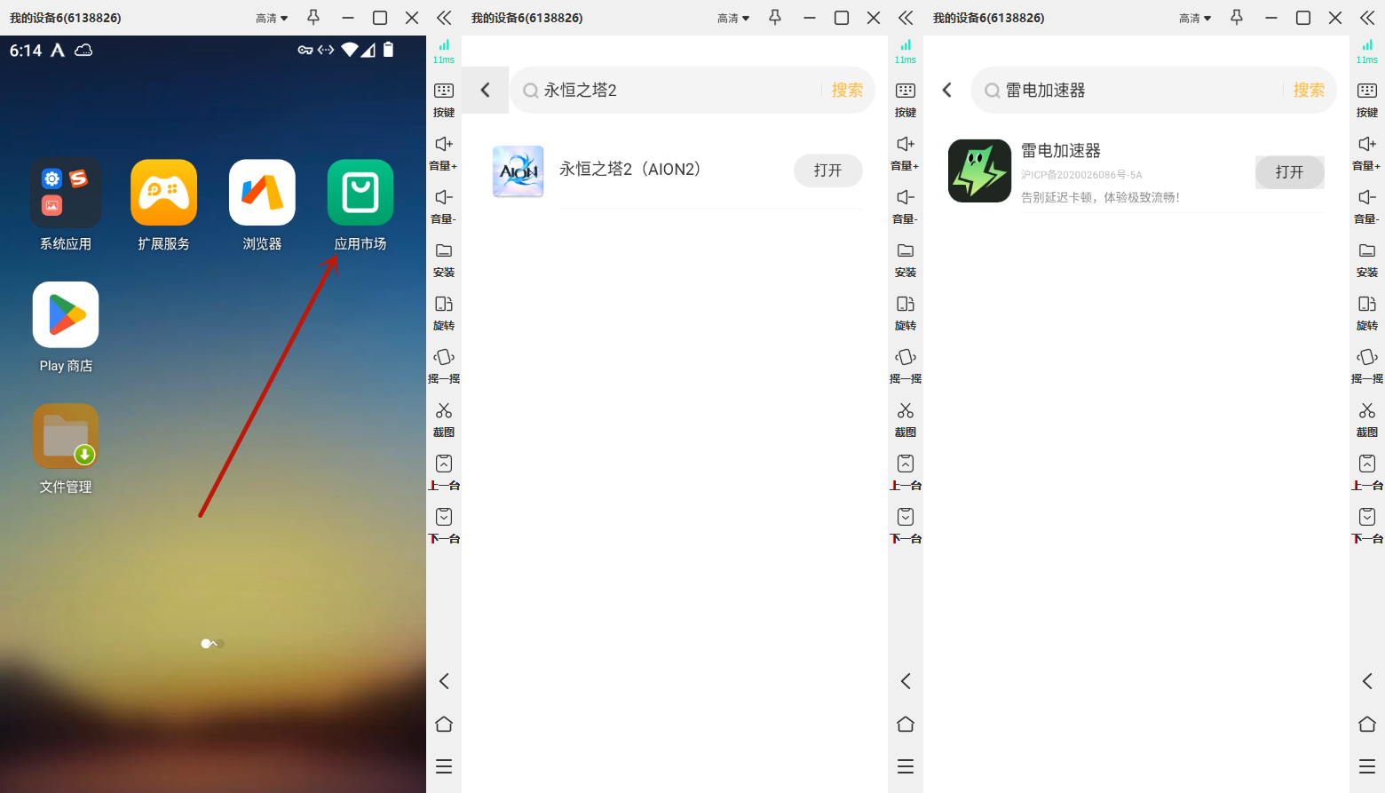 随后在添加的云手机里面打开应用市场,搜索“永恒之塔2”和“雷电加速器”这两个装上。