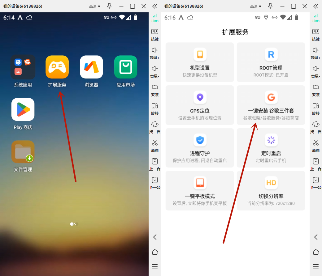 下面是以谷歌账号来登录的,所以在打开云手机里面的“扩展服务-一键安装谷歌三件套”,装好以后会重启设备,重启即可,到这里为止准备工作就准备好了。