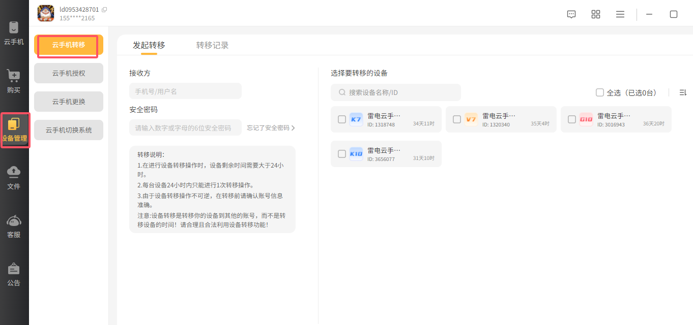 3、选择需要接收设备的账号(可以是账号ID或者手机号码),再输入安全密码,点“确认转移”,转移时会有提示,点确定即可。