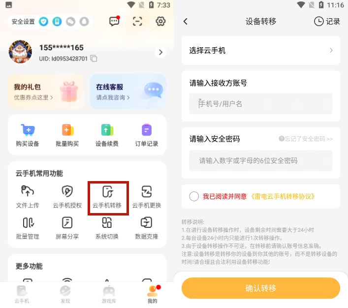 1、在云手机界面,点击我的-云手机转移