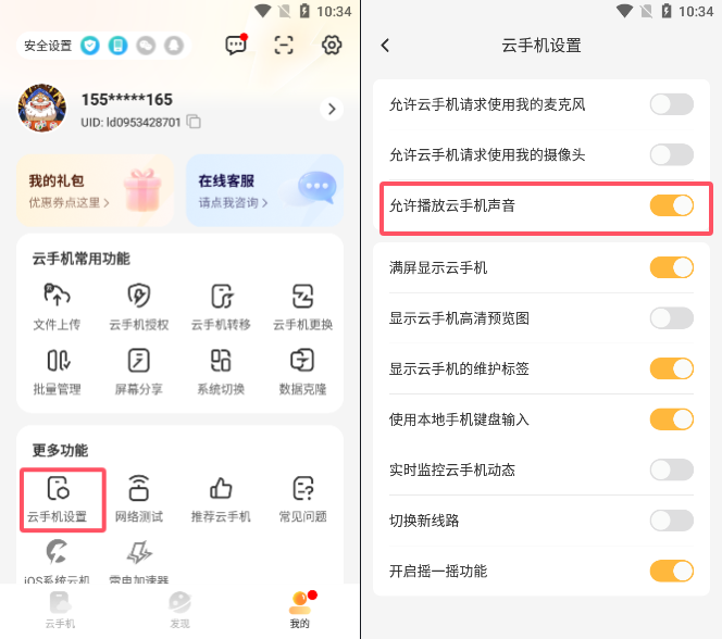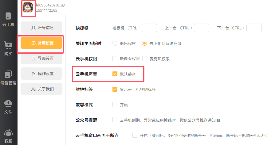 点击头像,然后点“常用设置”,看看是否开启了云手机的静音,然后在操作界面控制音量大小
